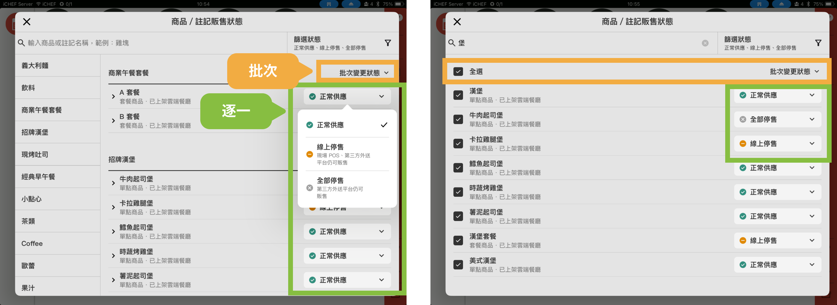 變更商品/註記販售狀態僅適用於 iCHEF POS App 與雲端餐廳線上點餐。第三方外送平台因整合限制,若需停售,請至該平台系統操作。