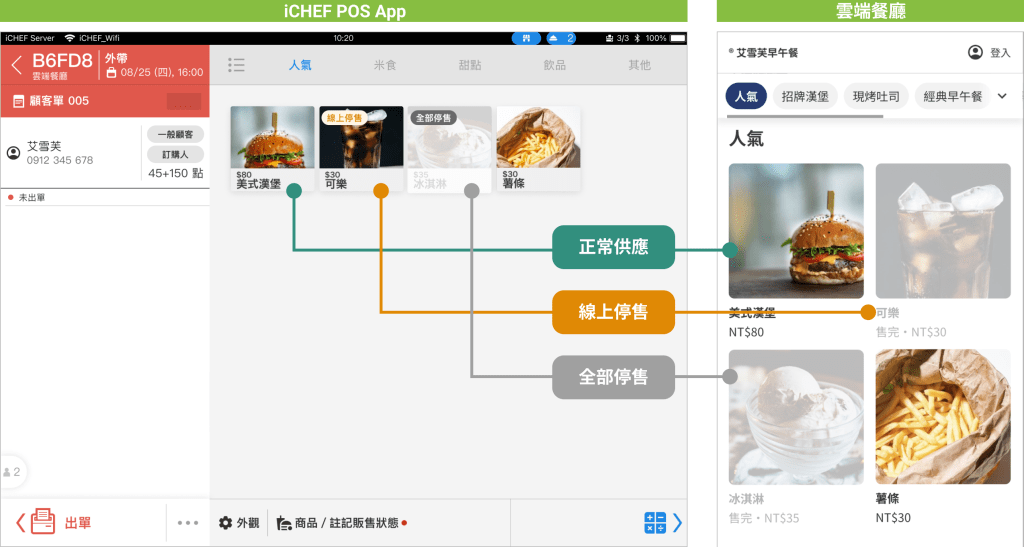 – 當「線上停售」的商品,從雲端餐廳下架後,狀態仍會維持「線上停售」,可隨時手動調整該品項在 POS 的實際販售狀態。