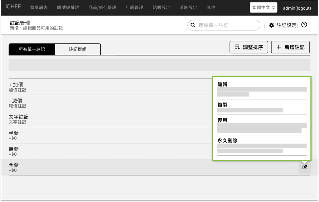 當註記停用時,註記將不會顯示在 iCHEF POS、雲端餐廳與第三方外送平台,此操作不會將註記刪除,並且在未來可以重新啟用,註記的資料不會有中斷的情況。