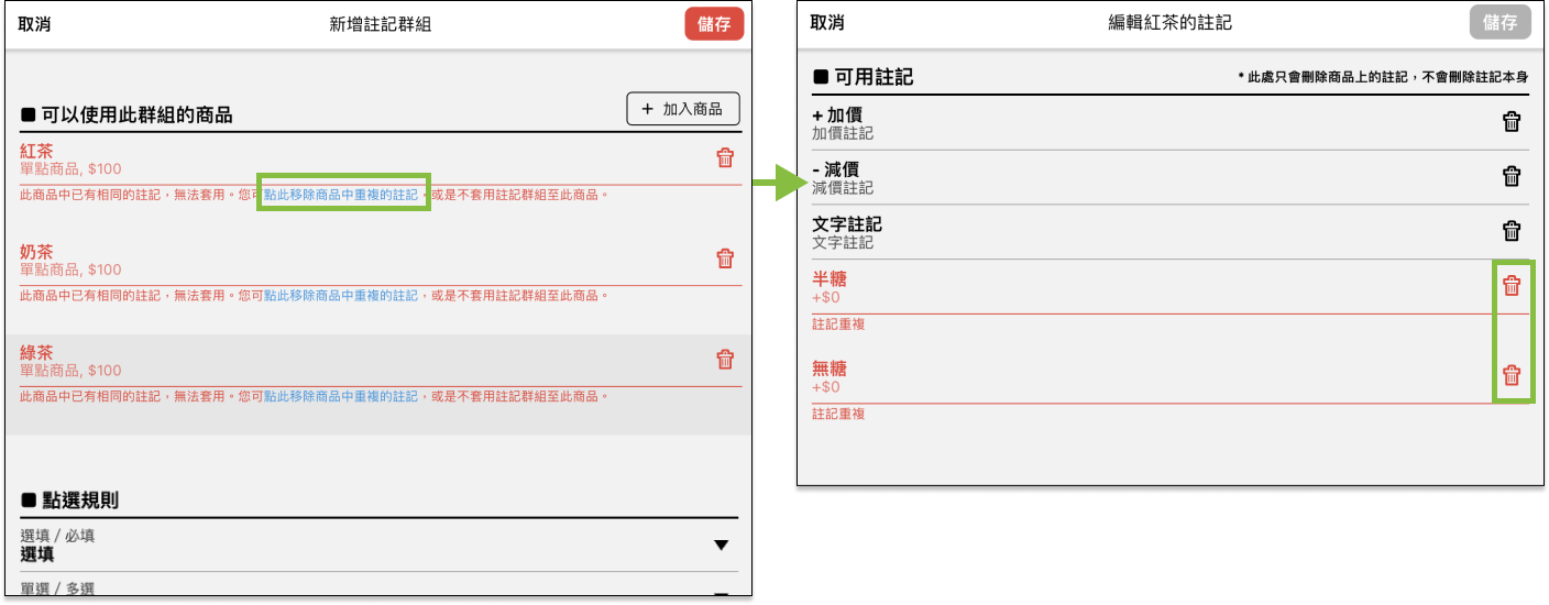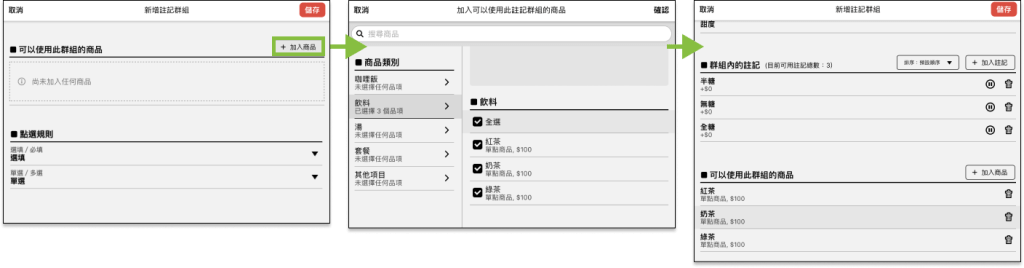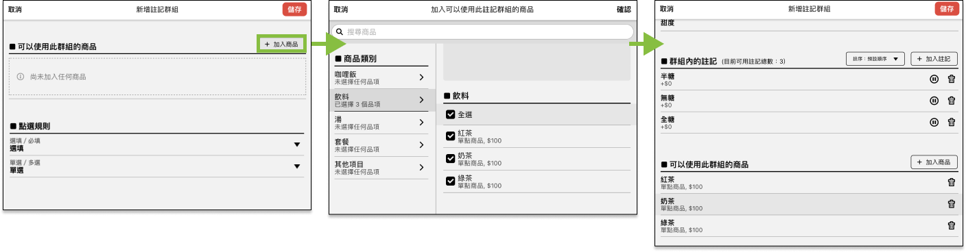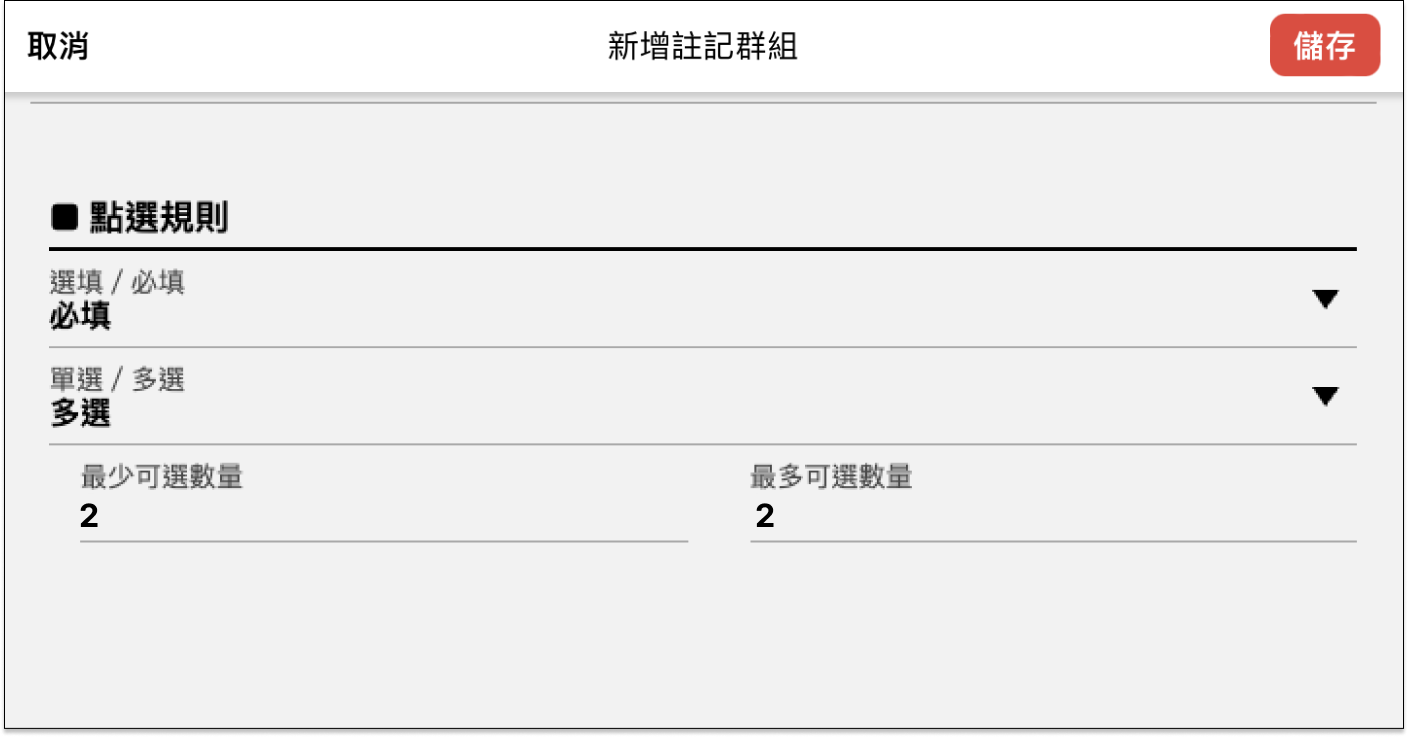 註記群組由多個單一註記組成,透過點選規則可以設定註記必選與可選的數量,例如:紅茶的甜度必須選擇正常糖、半糖或無糖,新增註記群組前,請確認組合的單一註記是否已經新增。