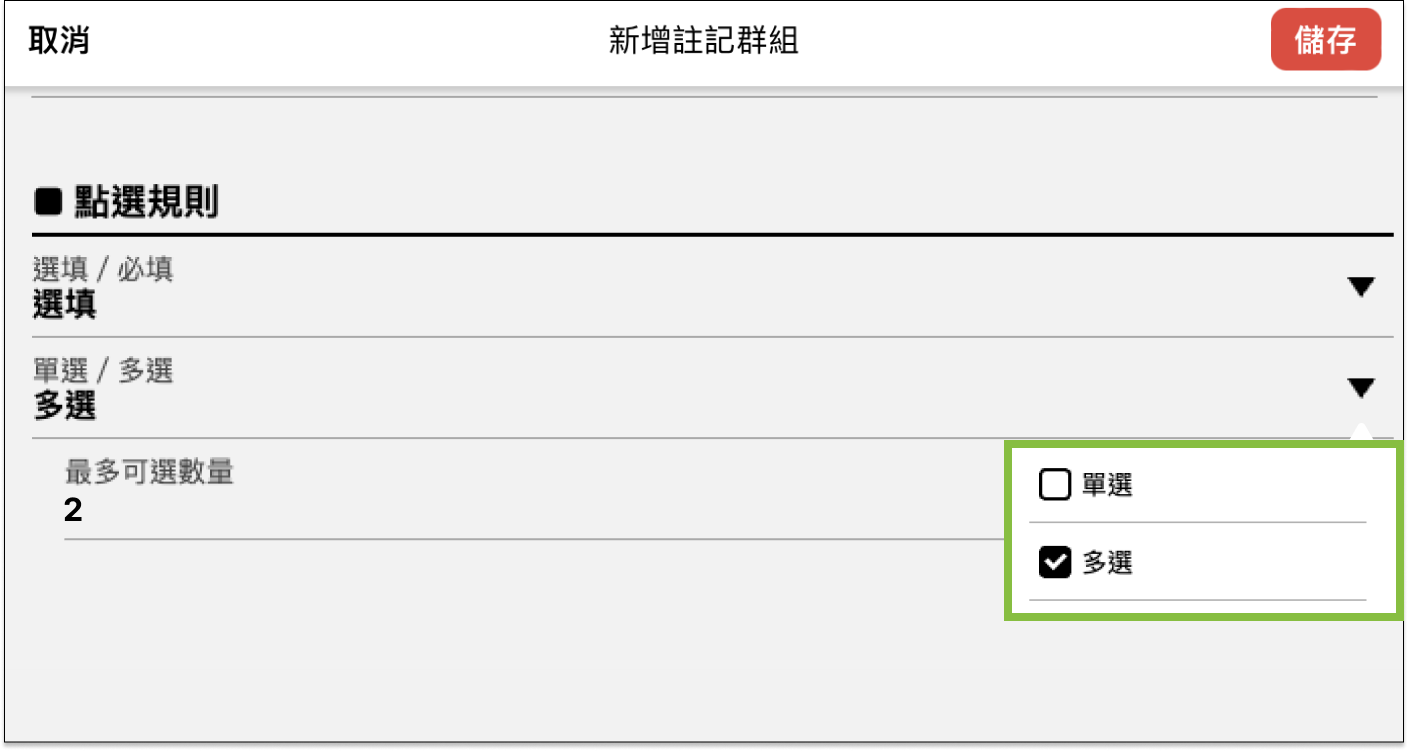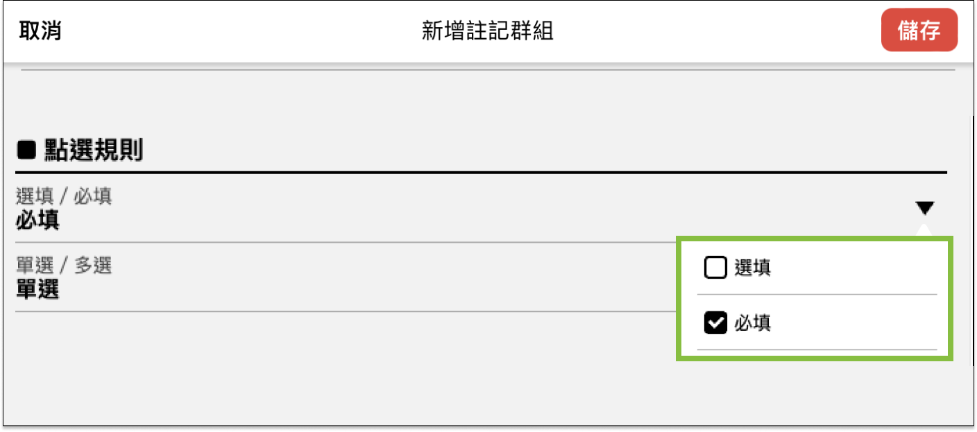 - 註記群組的點選規則可分為「選項/必填」與「單選/多選」,下面提供 2 種常見的點選規則做為示範