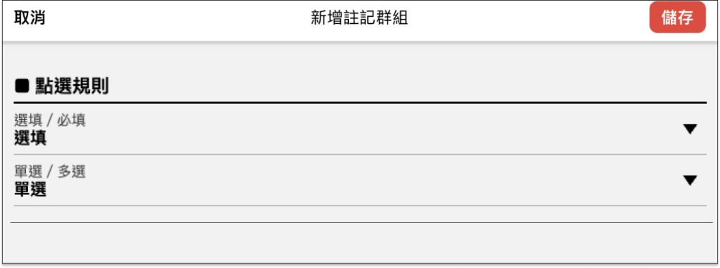 註記提供單一註記與註記群組 2 種設定模式,單一註記為可單選的註記,而註記群組是由多個單一註記組成,並且可以設定點選規則來避免點餐時缺少必要的註記。
