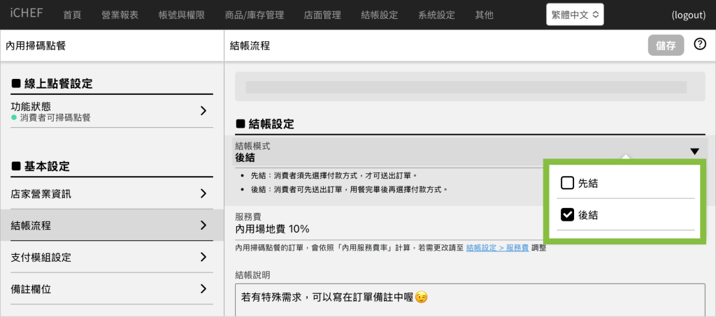 - 請至 雲端餐廳 > 內用掃碼點餐 > 結帳流程