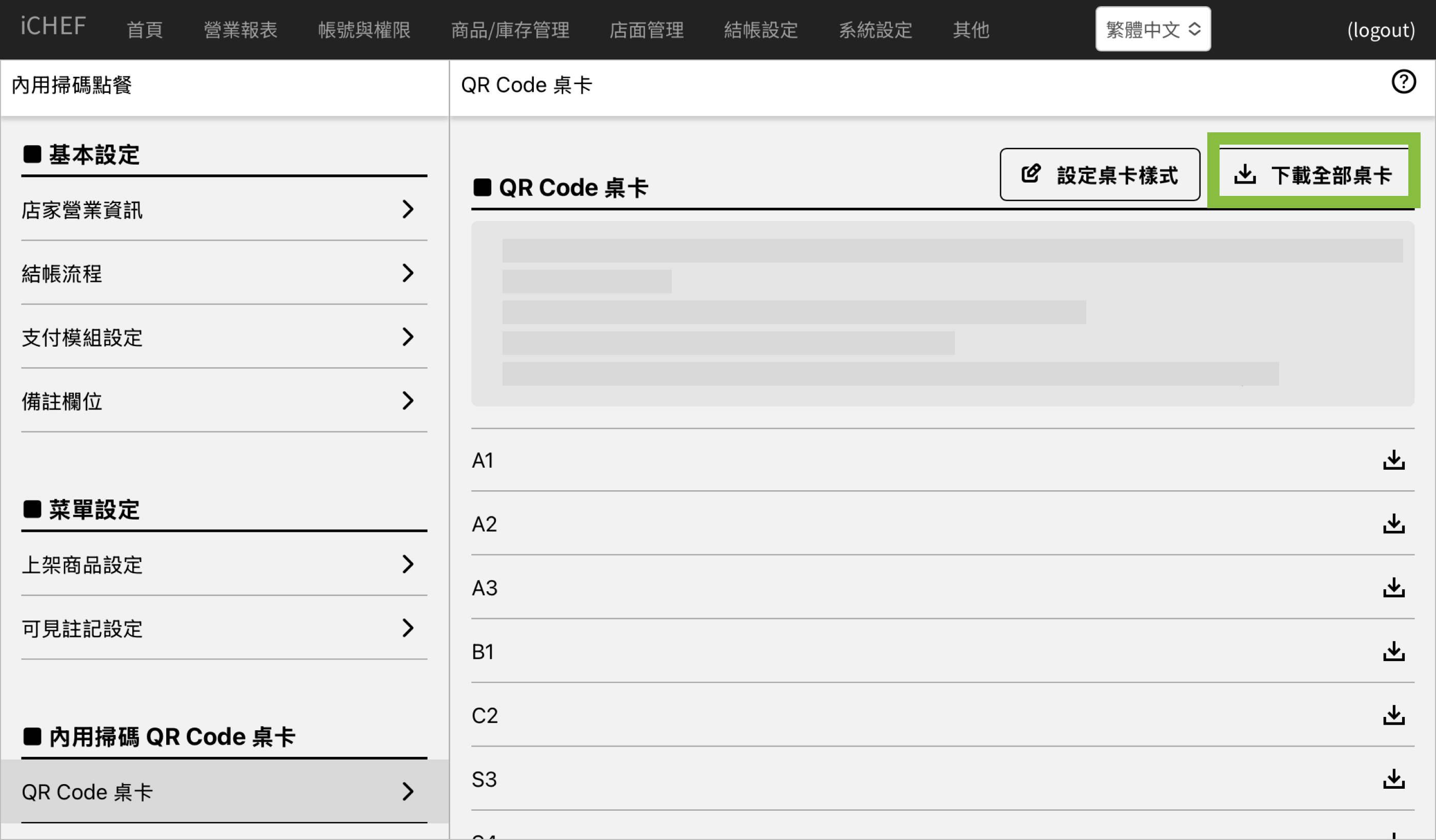 若是使用 iCHEF 後台所提供的桌卡 QR Code,在調整先結或後結的設定後,桌卡 QR Code 的樣式也會同時變更,請重新下載桌卡 QR Code 以利消費者依照桌卡上的指示完成點餐與結帳。