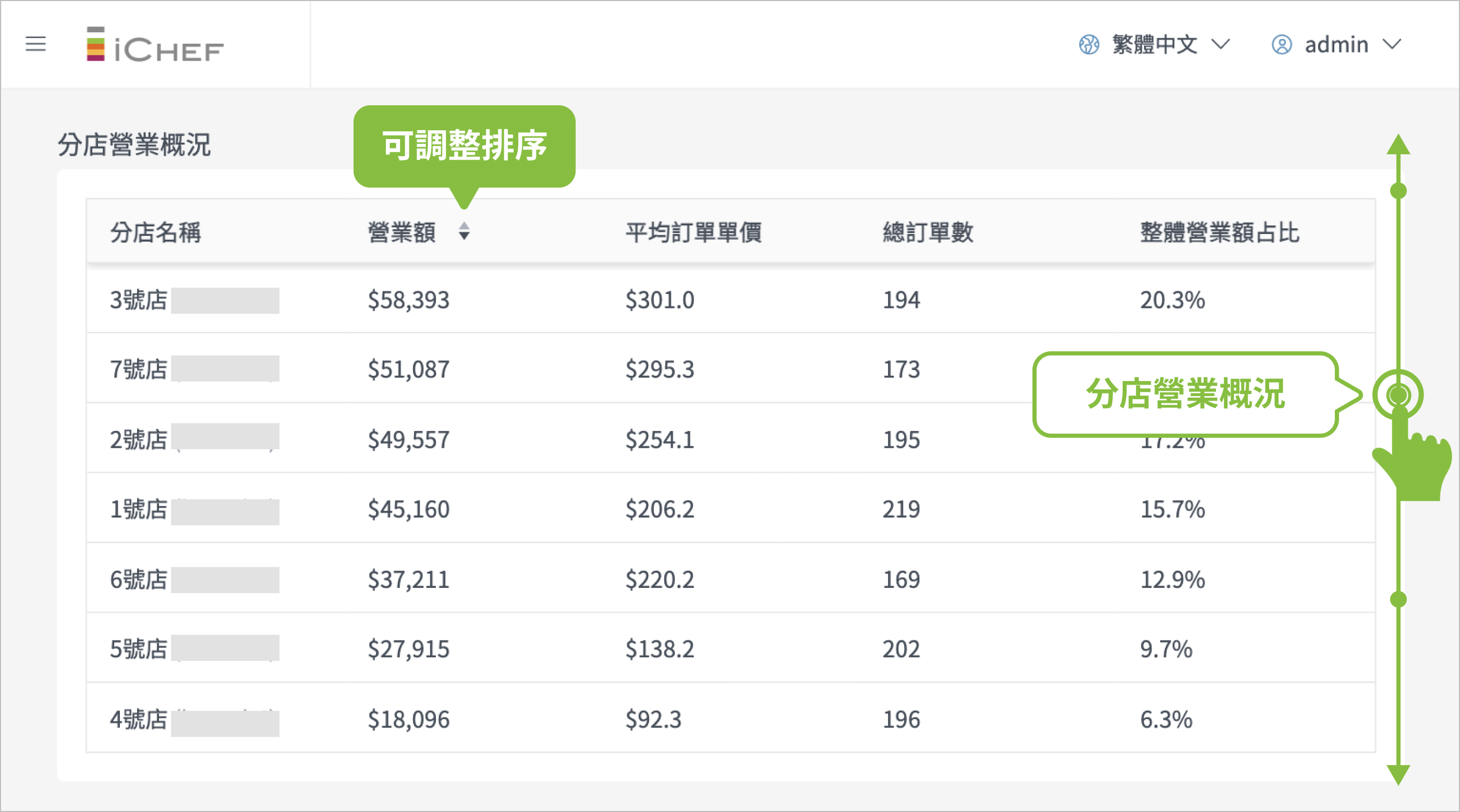 想知道是整體的變化,還是單店的影響?在加總的表現之後,你就會看到拆分為各分店的即時數據,藉此不但能細分看出變化原因、整體占比,還能透過排序功能看到當前的營業排行。
