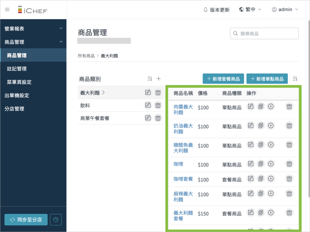 - 步驟 1:選擇操作項目,點擊「新增單點商品」、「新增套餐商品」按鈕或「編輯」圖示。