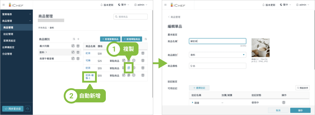設定完商品後,也可以延伸為商品設定對應的口味註記選項,以下將說明在後台可以針對商品設定的 6 項操作: