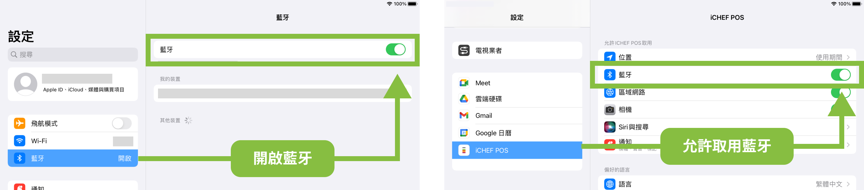 - 允許 iCHEF POS 取用藍牙開關關閉:請確認 iPad「設定 > iCHEF POS」取用藍牙已開啟。