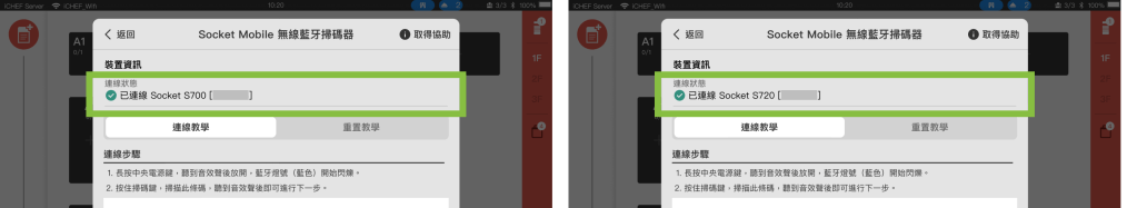 連線成功後,未來同時開啟 iCHEF POS App 與掃碼器時就會自動連線,不須重新手動連線。