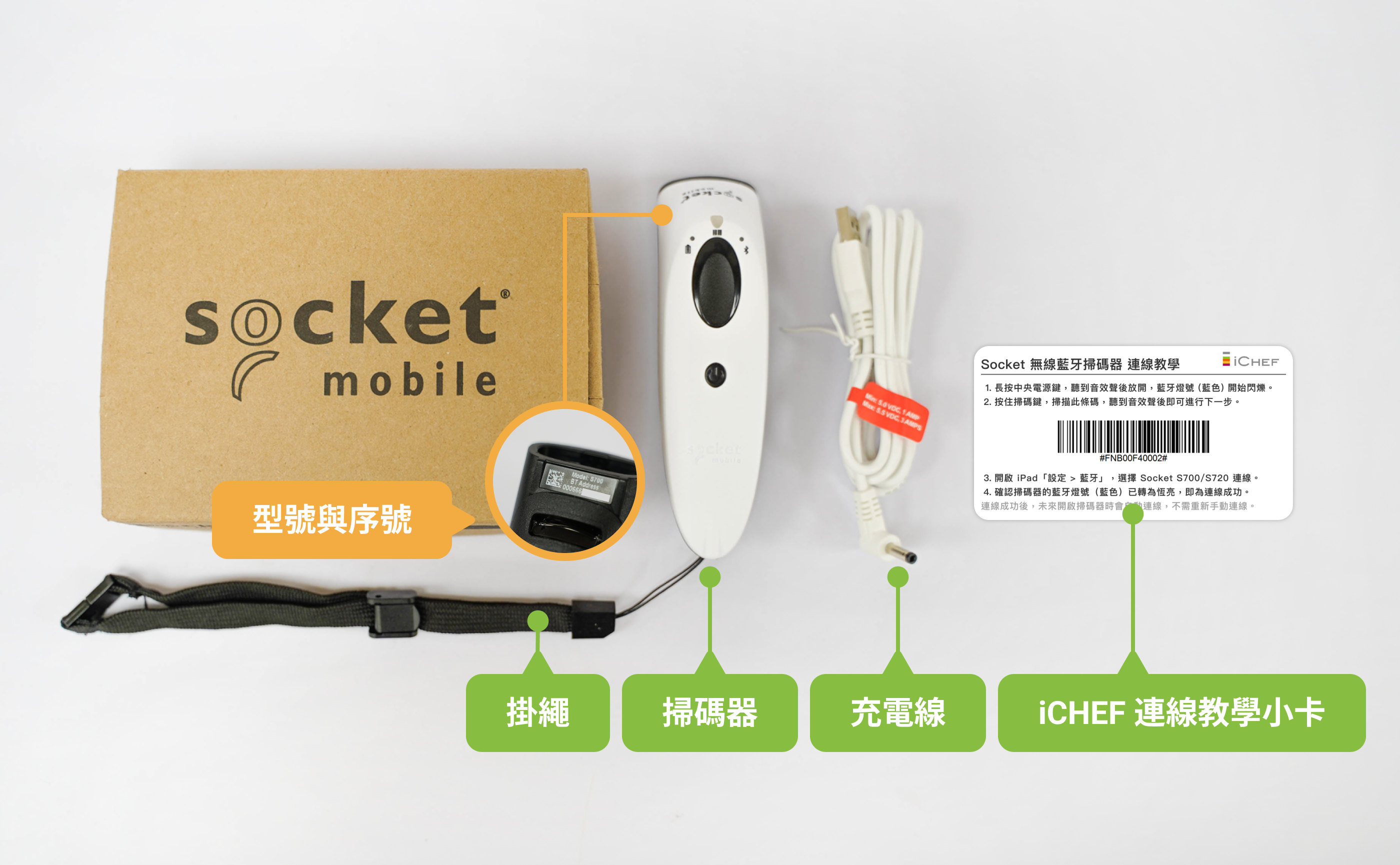 Socket Mobile 無線藍牙掃碼器(S700/S720)可於 iCHEF 後台 > 採購服務 下單,到貨時將會收到以下配件:掃碼器、掛繩、充電線、iCHEF 連線教學小卡、原廠說明書(*S720 限定:附贈充電座)。