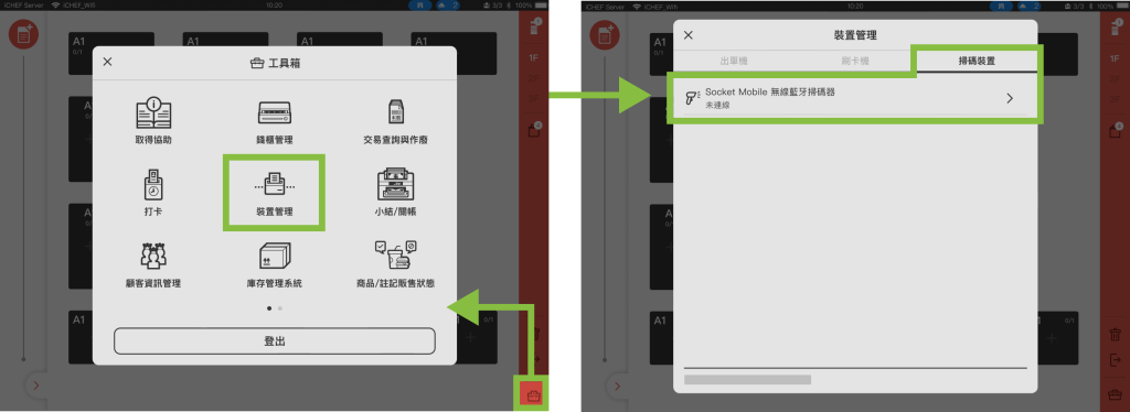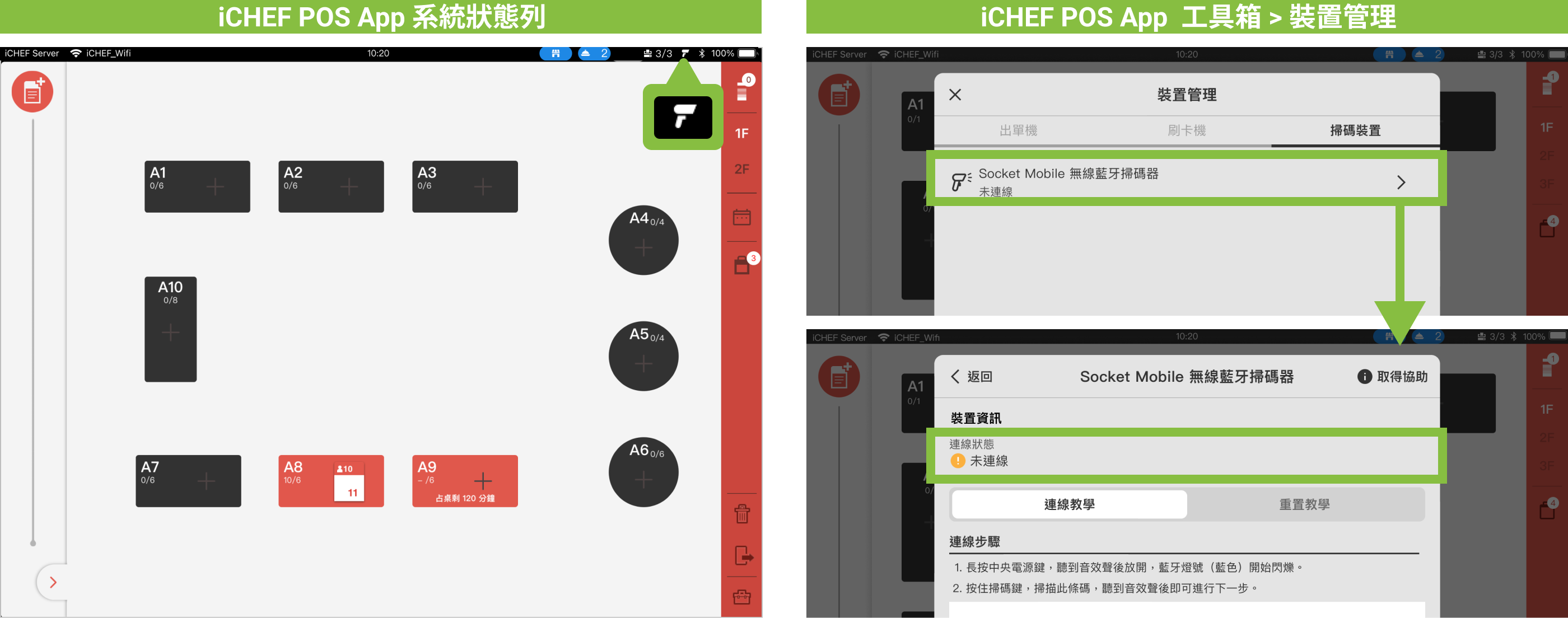 在 iCHEF POS App 上方的「系統狀態列」與「工具箱 > 裝置管理」皆可查看目前掃碼裝置連線狀態。