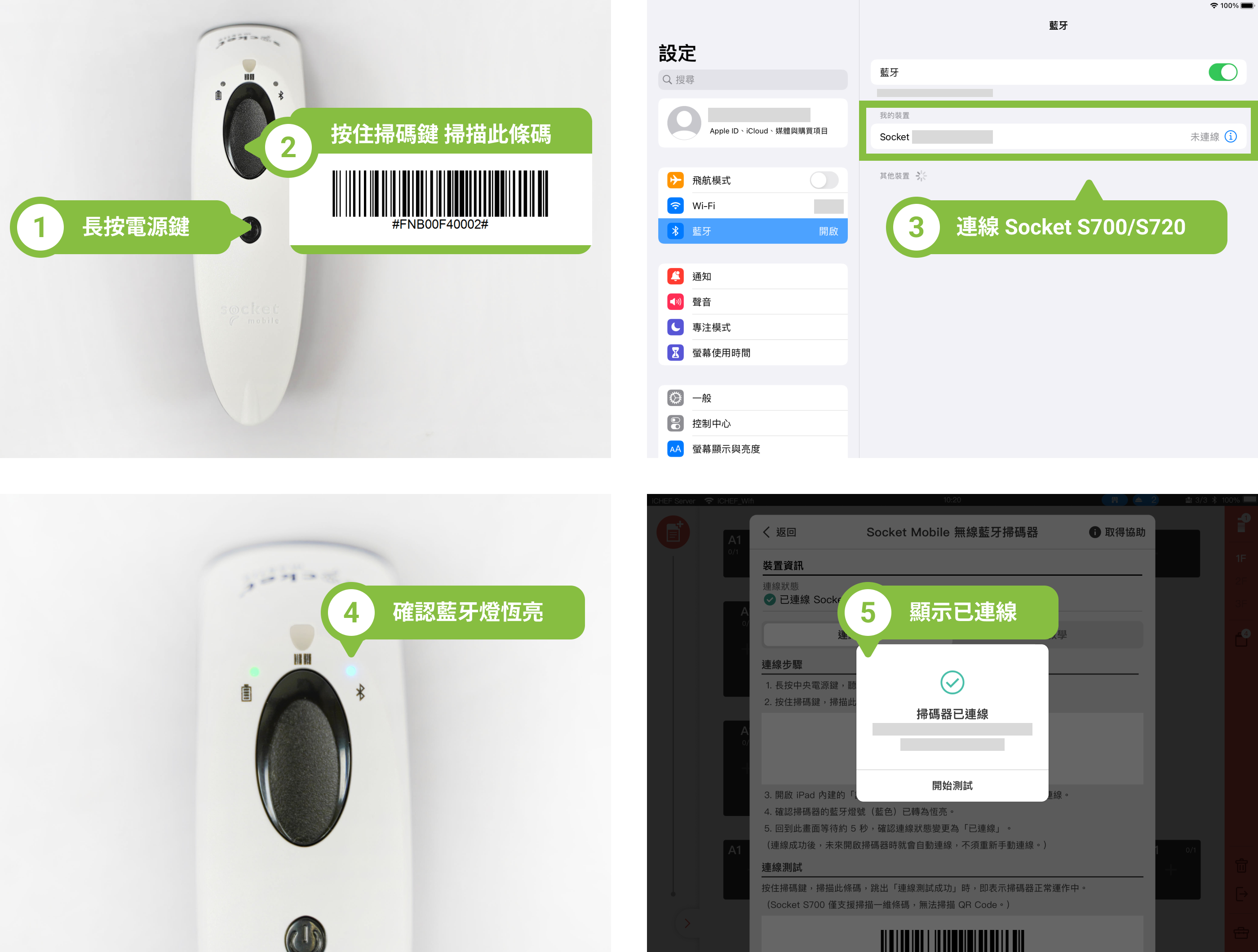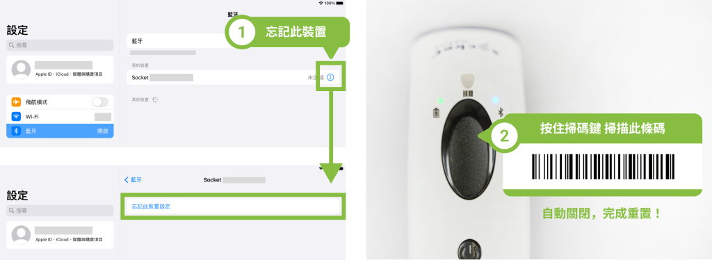 - 步驟 1:進入 iPad 內建的「設定 > 藍牙」,在裝置中找到 Socket S700/S720,點擊右側的「i > 忘記此裝置設定」。