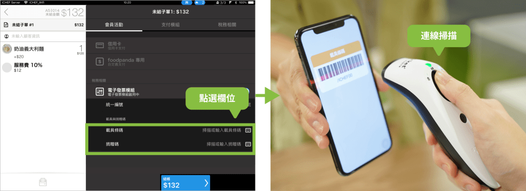完成連線後,結帳時即可透過掃碼器掃描「載具條碼」與「行動支付付款碼」。