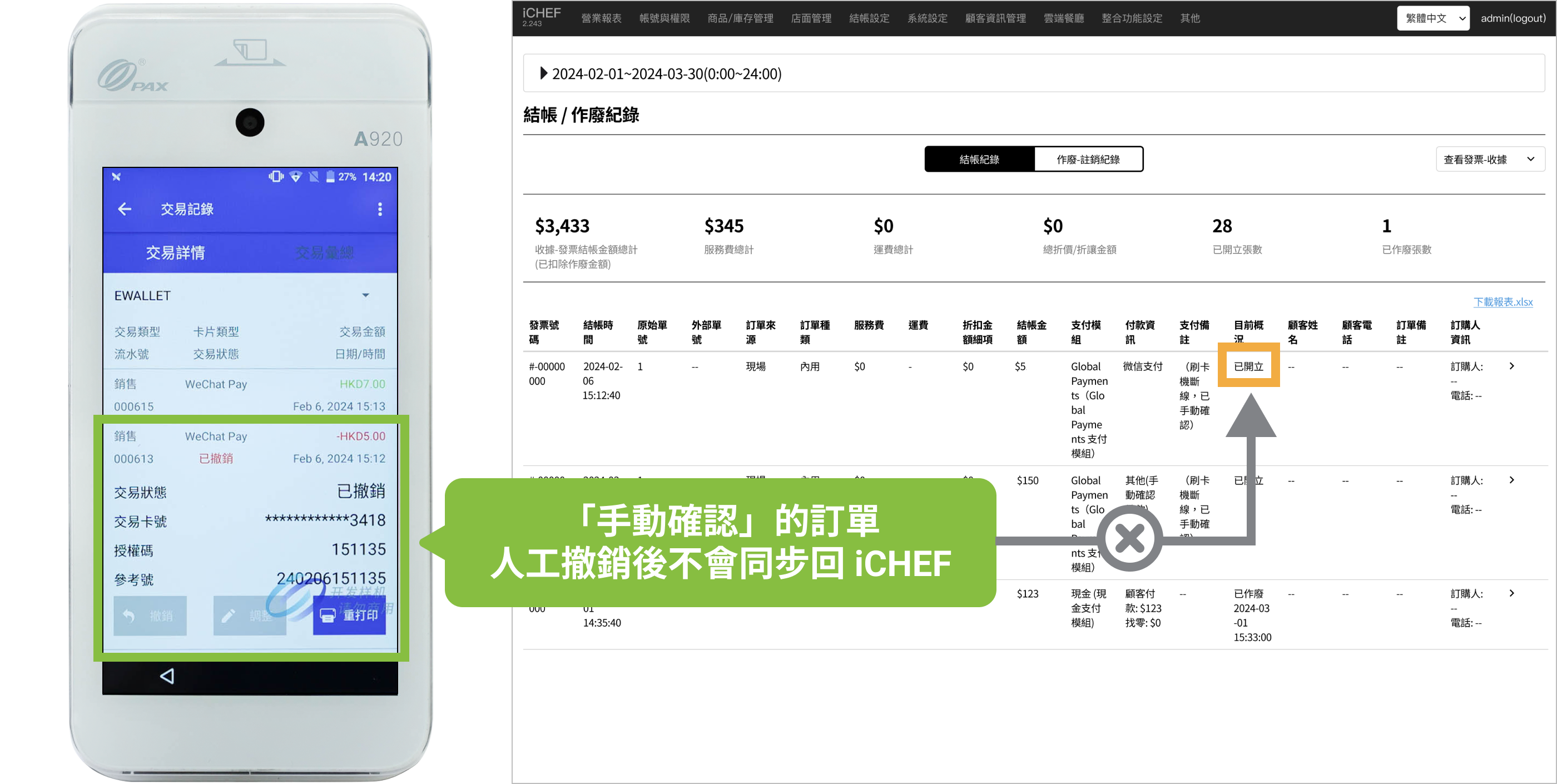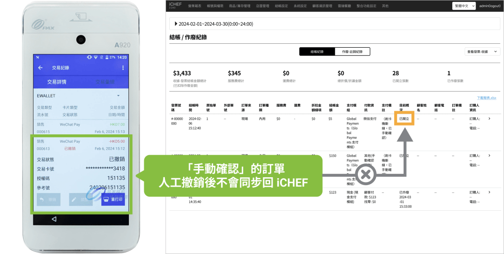 人工作廢的交易,僅會在 Global Payments 報表中正確顯示,iCHEF POS 將無法取得人工異動的資料,因此在 iCHEF 後台報表中,此筆交易仍為「已開立」。