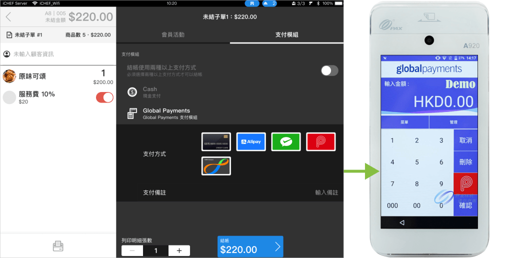Global Payments 刷卡機已和 iCHEF POS 整合。開通此功能即可透過 iCHEF POS 連動 Global Payments 刷卡機收款,不用額外手動輸入金額,就能完成現場的訂單結帳!