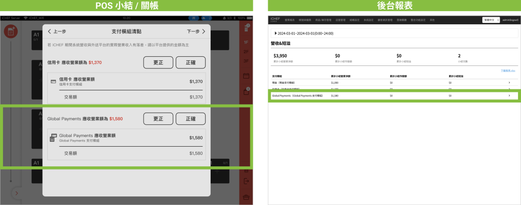 不論是在每日的小結、關帳,或是後台的報表,iCHEF 都為 Global Payments 設置了專屬的區塊,讓你更快掌握來自 Global Payments 刷卡機的交易額,輕鬆對帳。