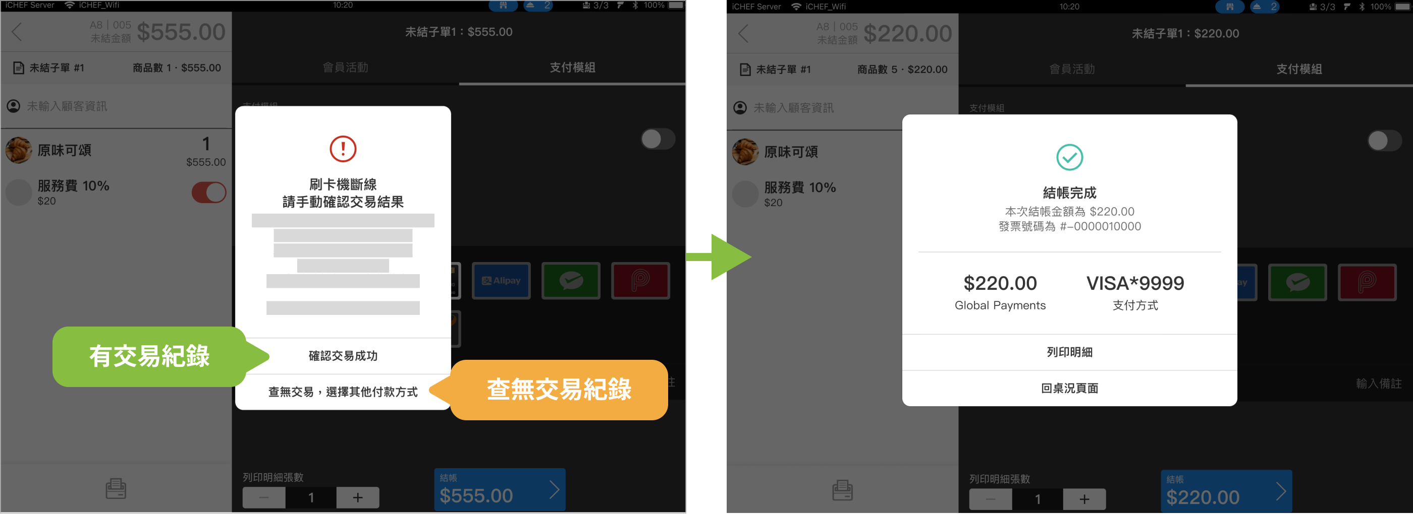 使用 iCHEF POS 可以整合 Global Payments 刷卡機收款,但因環境或設備因素可能導致連線中斷,交易結果無法回傳給 iCHEF POS。