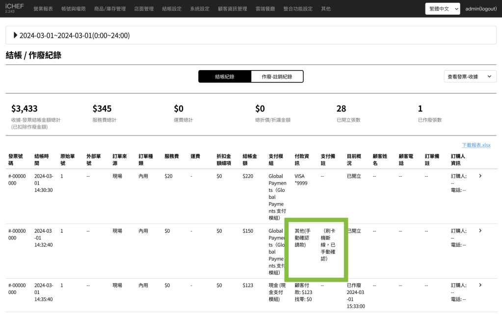 人工退款/作廢可能會造成 iCHEF 後台與 Global Payments 最終款項無法對齊,請查看人工退款/作廢須知。