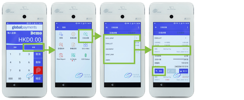 若為手動確認的交易,退款/作廢須操作 Global Payments 刷卡機,步驟如下: