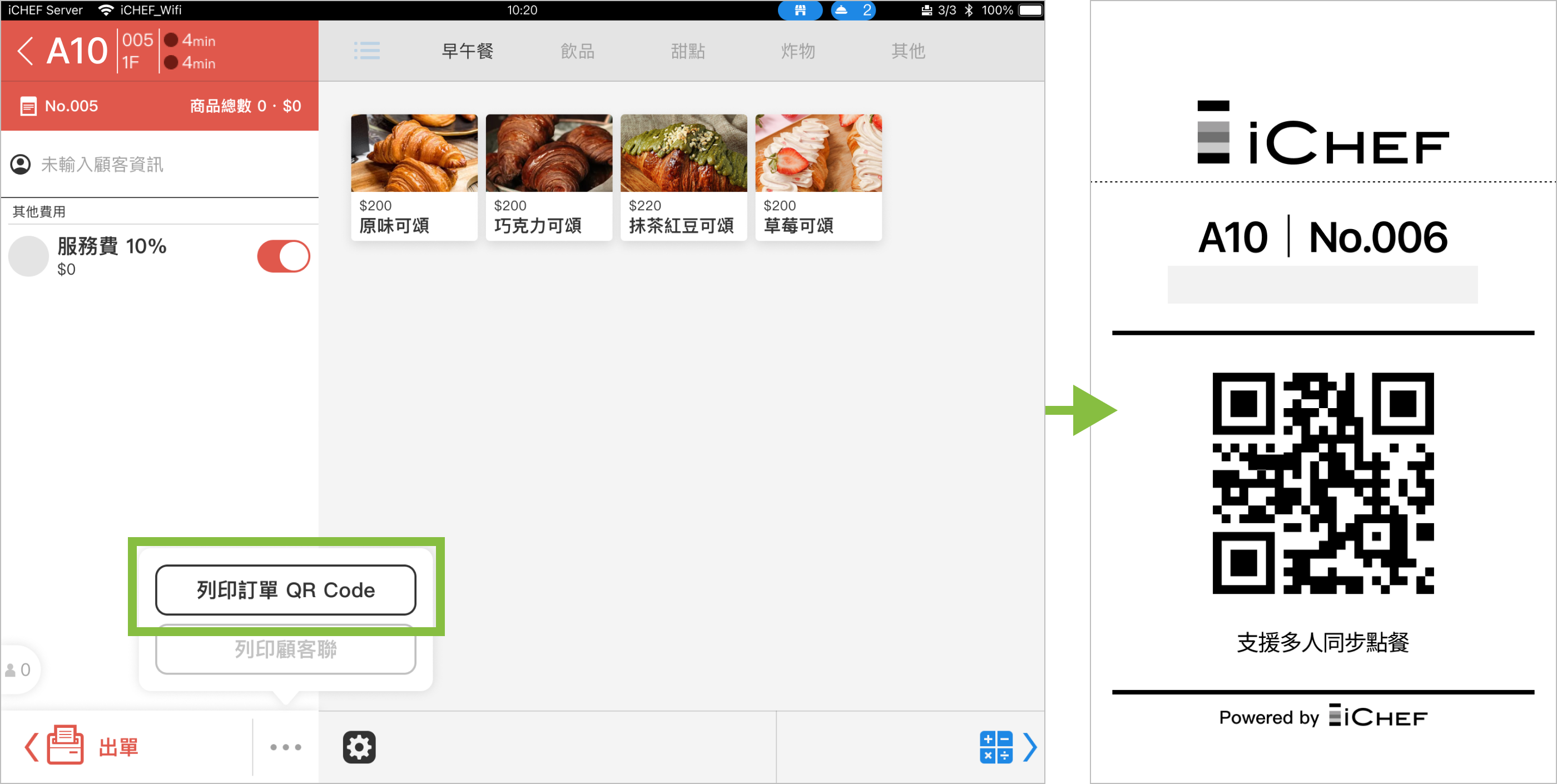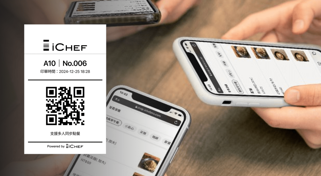 內用掃碼點餐的「訂單 QR Code」專屬於每組客人,支援多人掃描、同步點餐!在 iCHEF POS App 內用開單後,即可由出單機列印,建立一張新訂單。