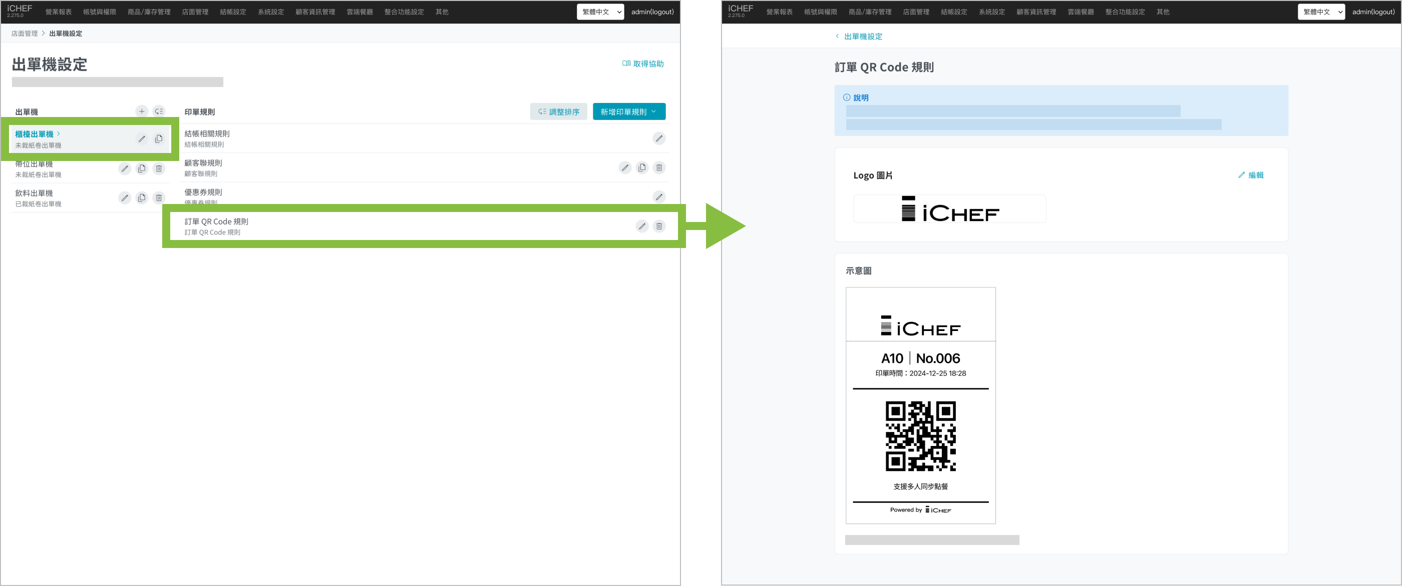 | 列印位置 | iCHEF 後台會依「桌位」生成對應的 QR Code 桌卡。 下載檔案並列印,即可固定放置在桌位。 | iCHEF POS App 會在內用開單後,依「訂單」生成對應的 QR Code。 即可從店內出單機直接列印。 |