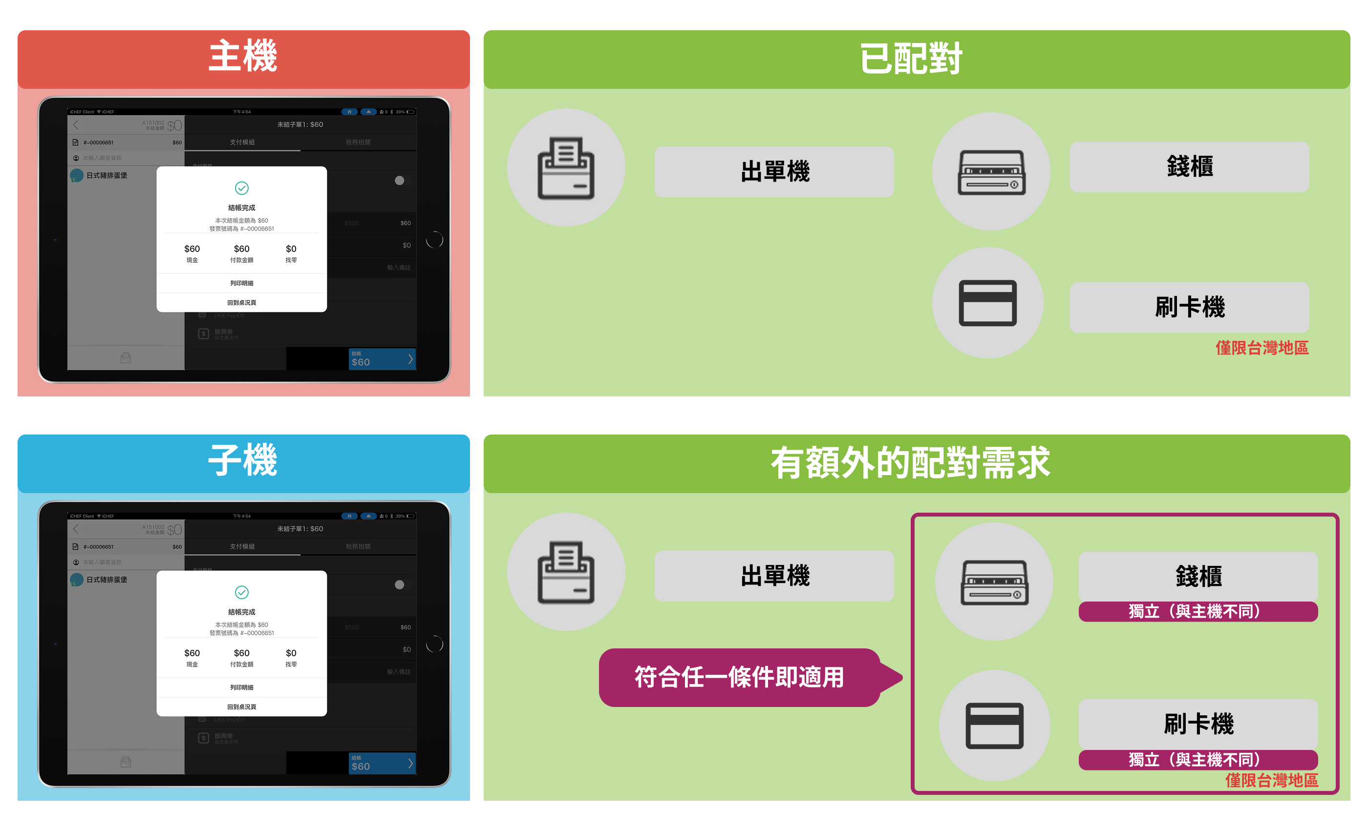 為 iPad 子機配對獨立的出單機與刷卡機,讓子機出單或結帳時能使用專屬的設備。