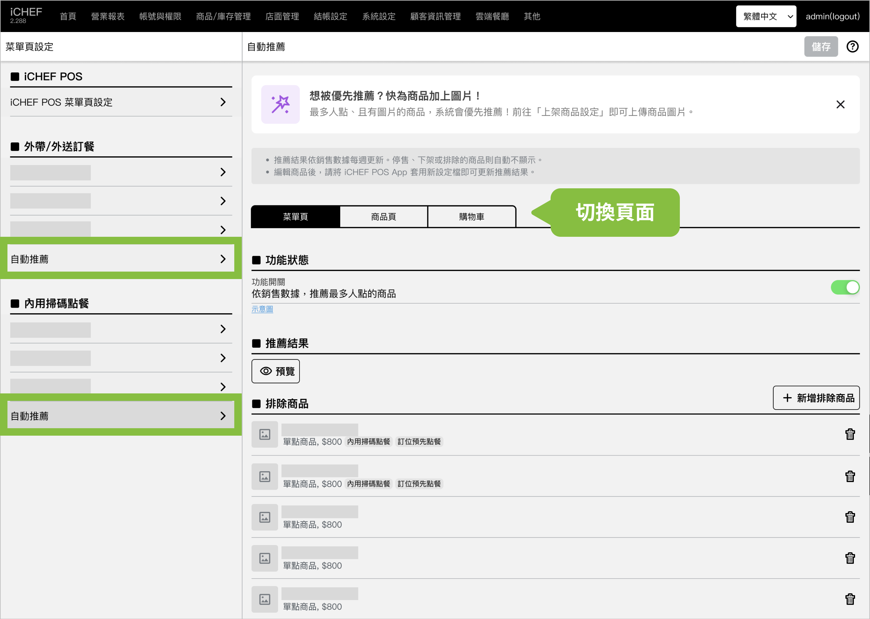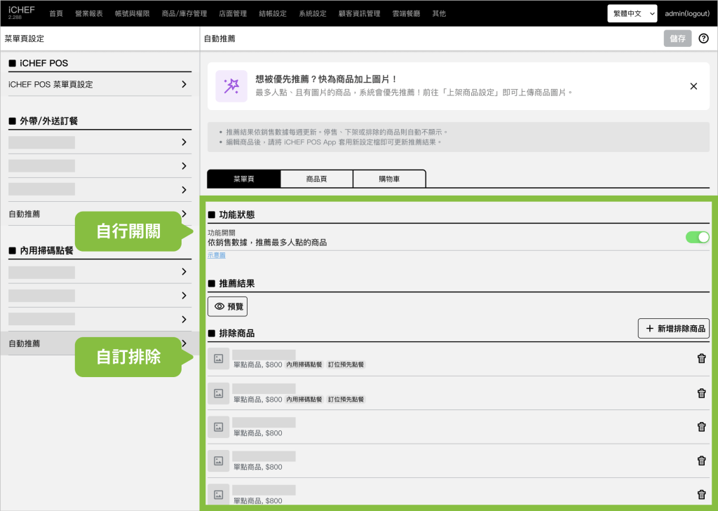 ➤ 後台位置:商品/庫存管理 > 菜單頁設定 > 外帶訂餐、內用掃碼點餐 > 自動推薦