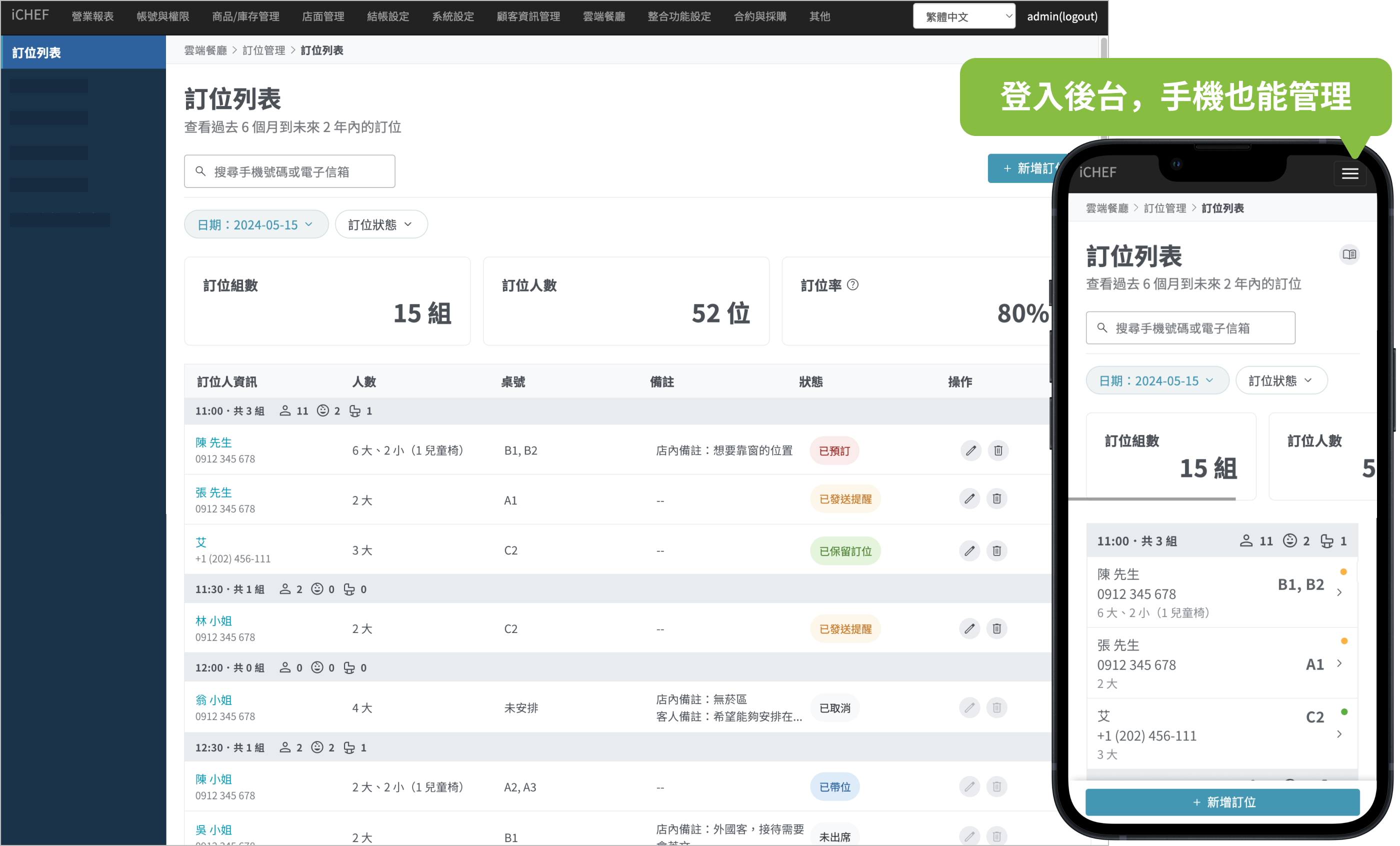 iCHEF 訂位管理除了在 iCHEF POS App 有專屬的管理頁面,在後台也提供即時同步的「訂位列表」。因此當你透過社群平台或其他管道收到訂位需求,不在店裡也能隨時用手機等行動裝置新增或修改訂位!