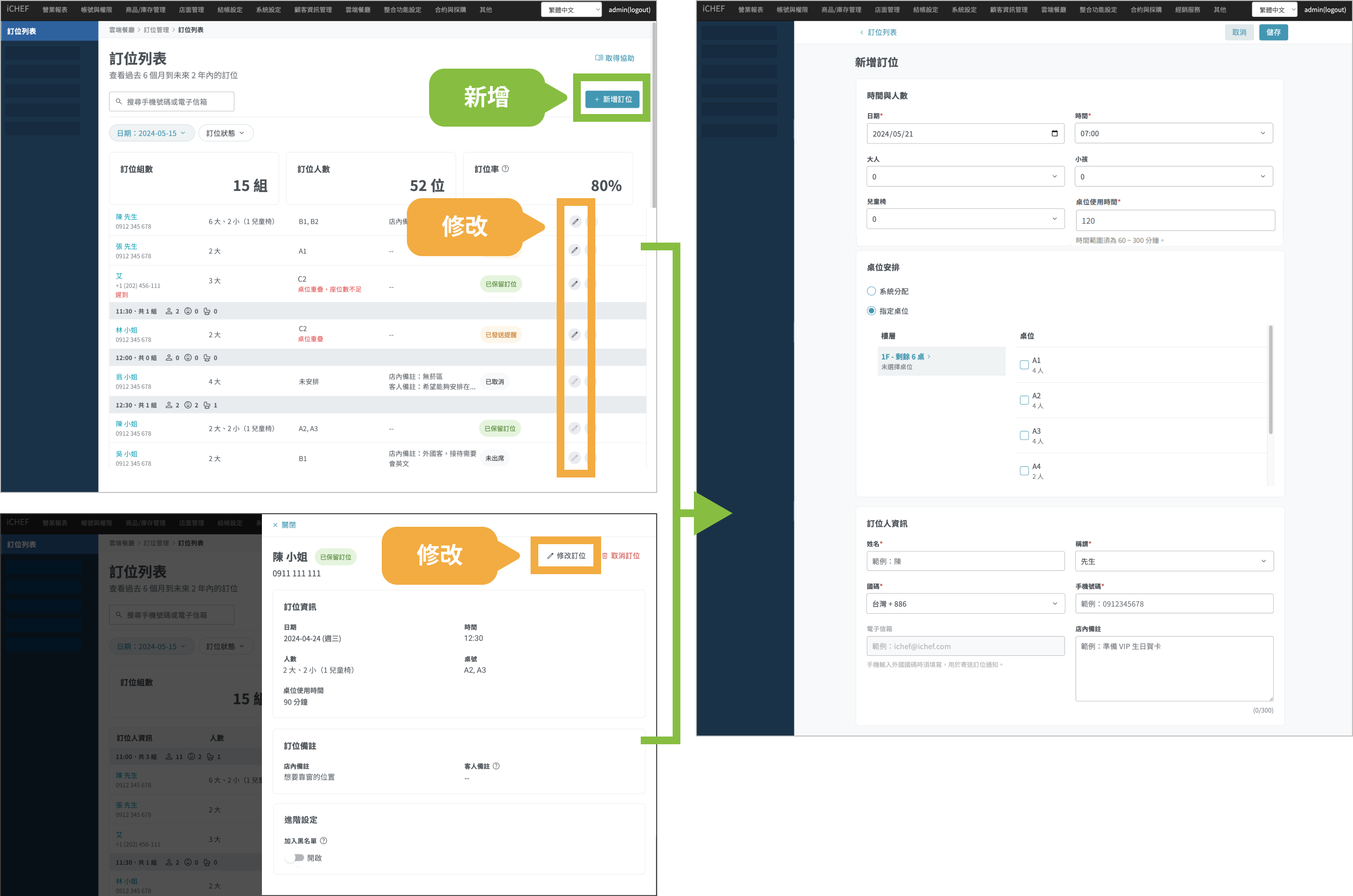 在消費者到店用餐前或訂位日結束前,可在列表中「修改」或「取消」訂位。操作說明如下: