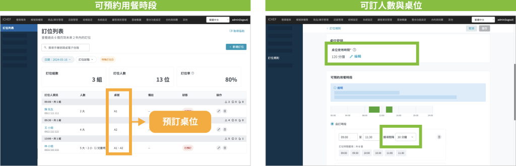 - 當日標籤:若有設定「特殊時間」將於訂位狀態的右側標示「特殊訂位日」或「不開放訂位」。