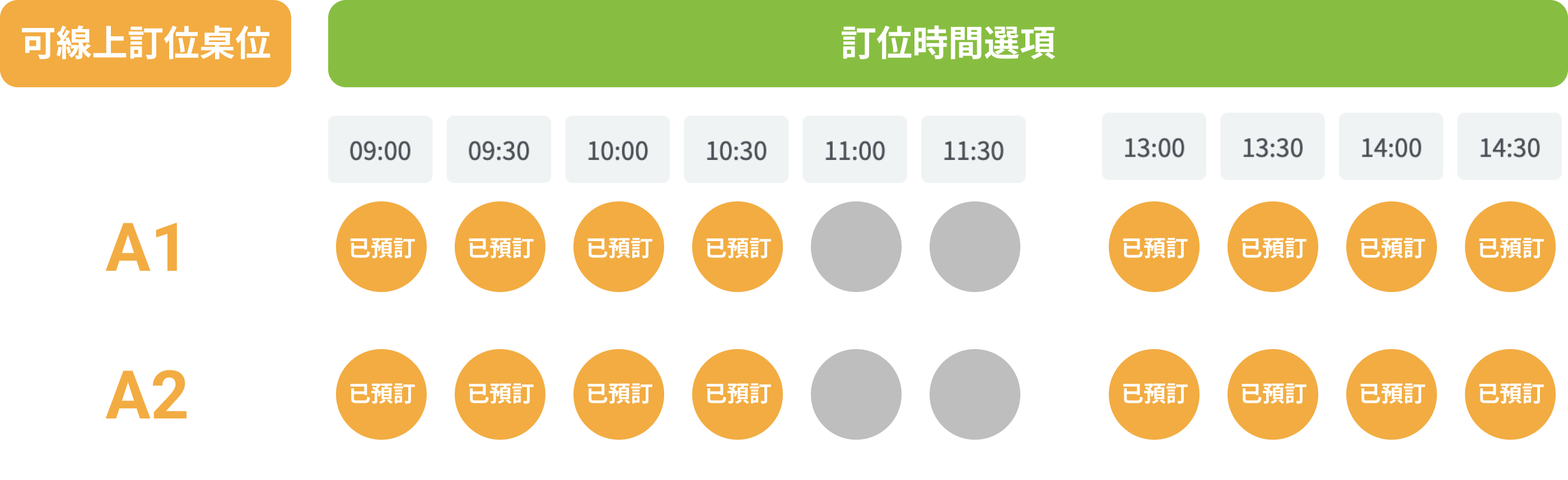 - 可預訂總數 = 2 桌 × 10 個訂位時間選項 = 20