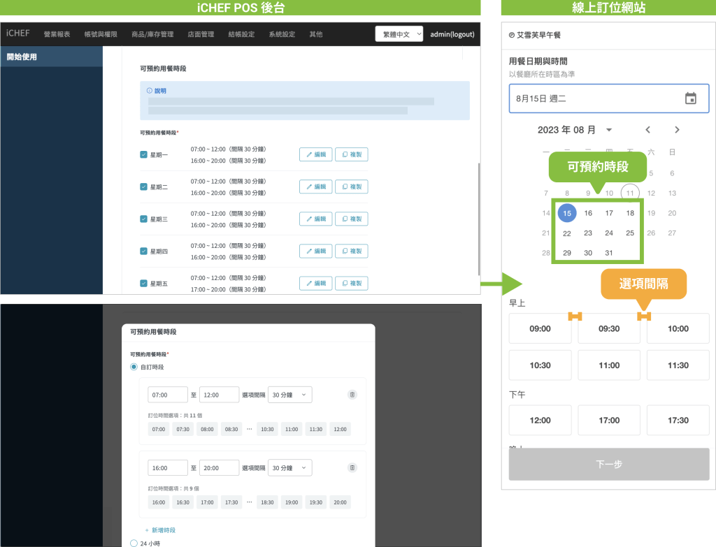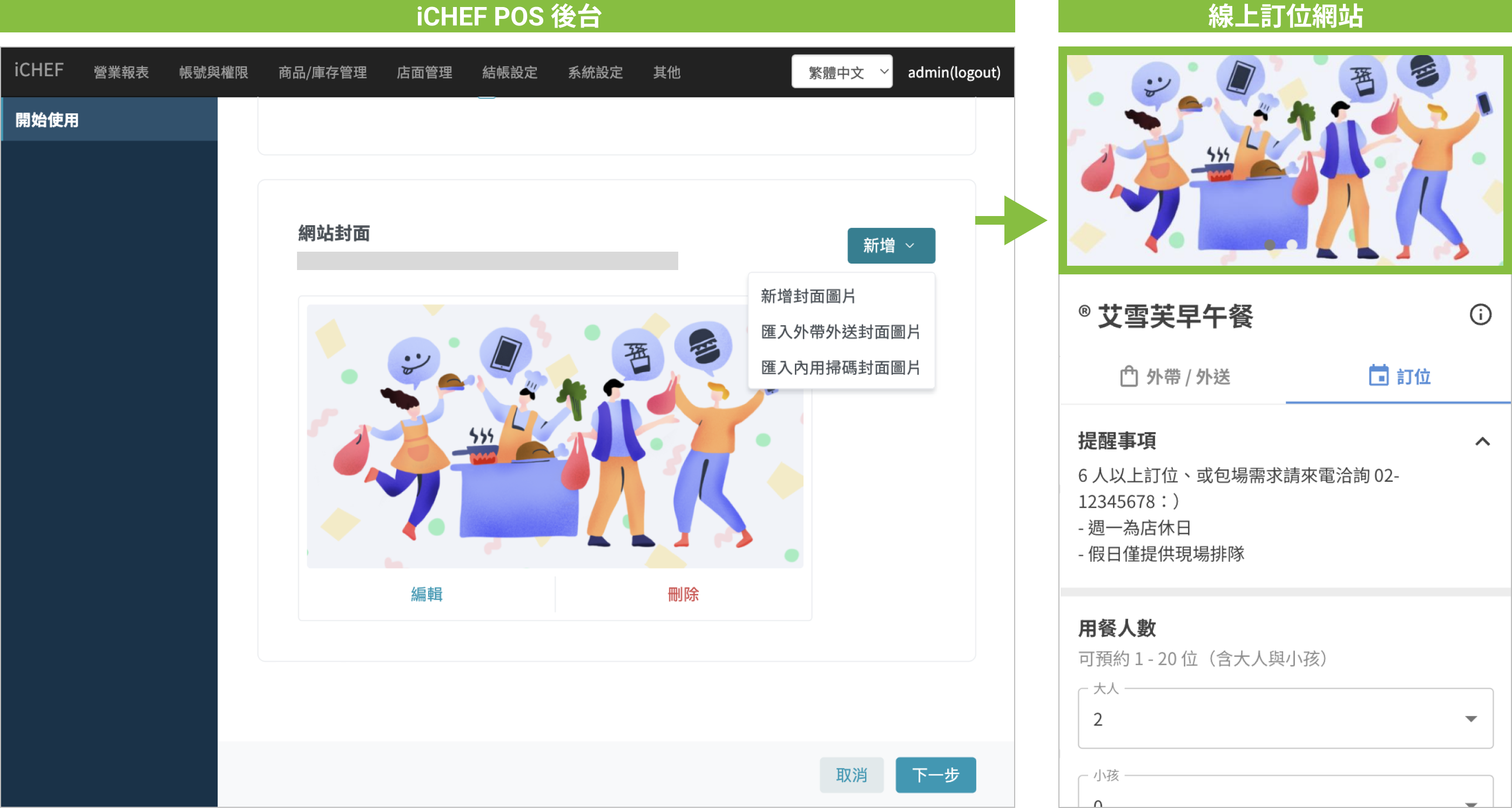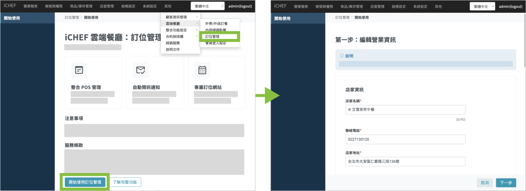 與 香港經銷商 (NCC) 購買雲端餐廳「訂位管理功能模組」 後 .,就可以回到「訂位管理」照著後台步驟完成設定,再到 iCHEF POS App 套用新設定檔,就能立即開通囉!