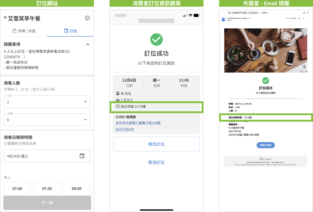 - 桌位安排:系統將依此判斷桌位的使用狀況,留下仍可給消費者選擇的時段。
