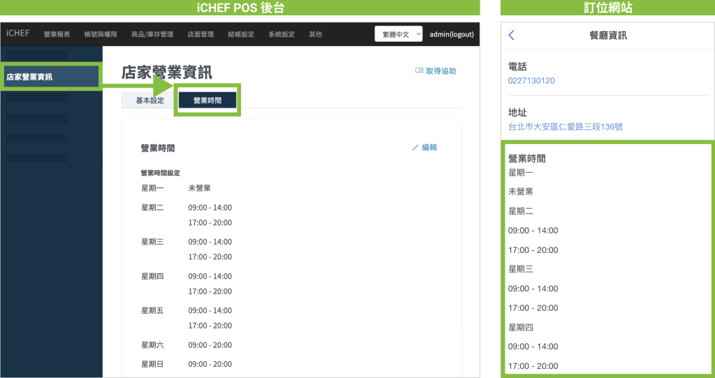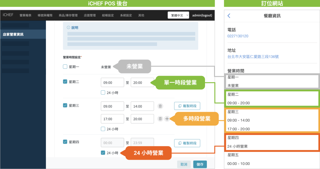 「營業時間」為餐廳的每日固定的營業時間範圍(非可預約用餐時段),儲存設定後會即時更新,顯示在訂位網站的「餐廳資訊」中。
