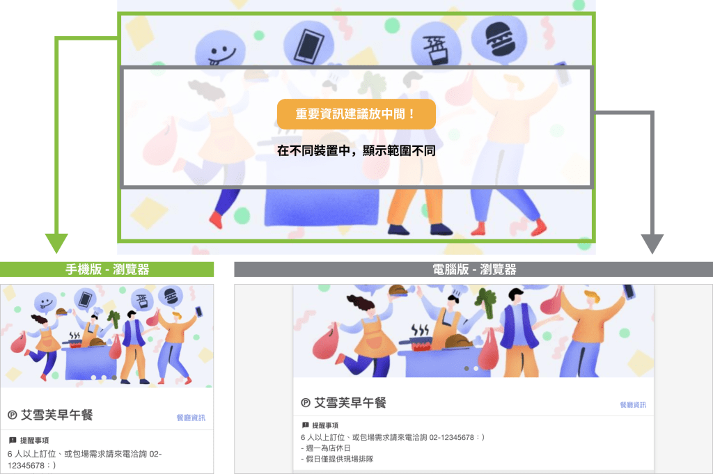 iCHEF 雲端餐廳爲響應式網頁,在手機、電腦上會變換為不同比例顯示,所以請記得將重要文字及內容放在中間區塊,以免被遮住囉!