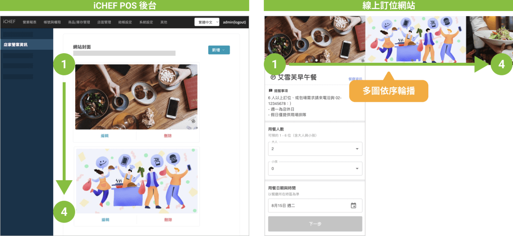 - 輪播順序:後台新增完顯示為上至下,而這個順序就會是「訂位網站」由左至右的輪播順序。