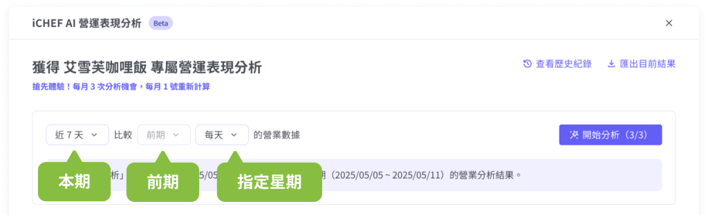 為確保提供最準確的營運分析,AI 僅能以完整一天(24 小時)的數據做計算,因此「當天」的營業數據需隔日才能分析。