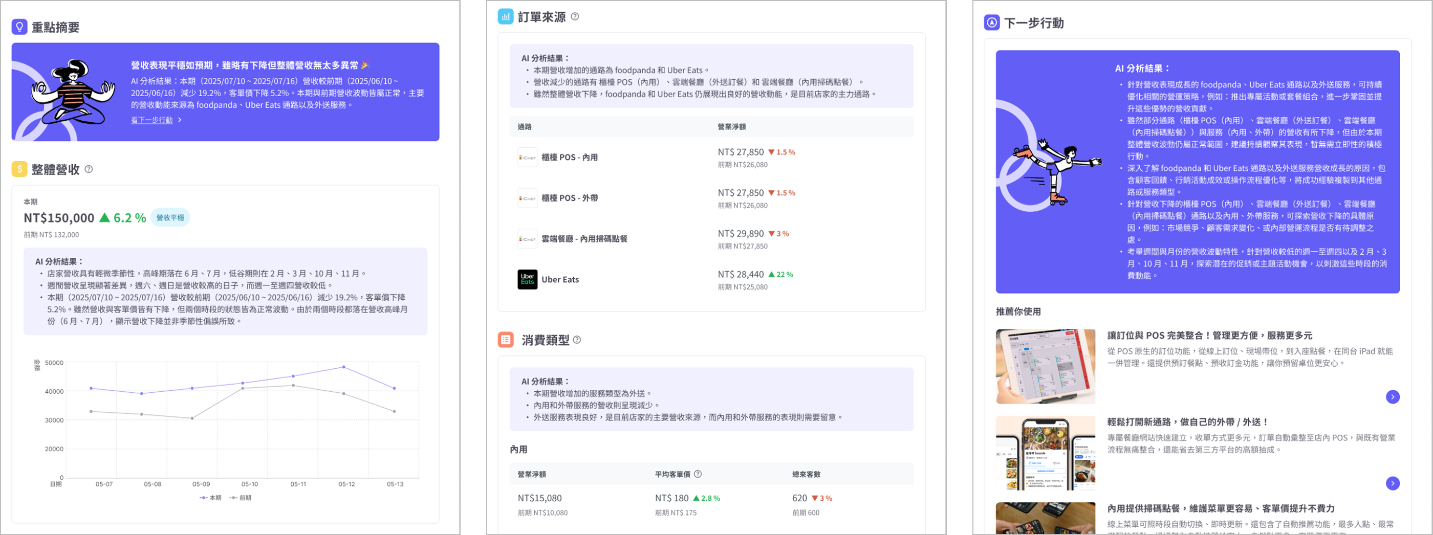 與「訂單來源」不同,將依照內用、外帶、外送的營收分別彙整,協助你觀察不同類型的消費表現。