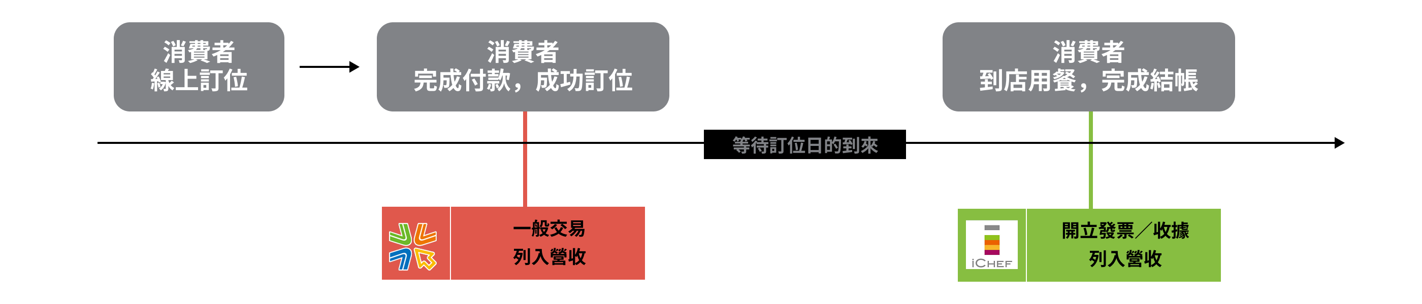 當消費者於訂位時支付預付款,第三方金流平台(如 Allinpay )會即時將付款金額列入記錄。不過,iCHEF POS 仍以更貼近餐廳實際記帳的方式,於預付款實際折抵消費或不退款(開立發票/收據)時,才會計入實際營收。