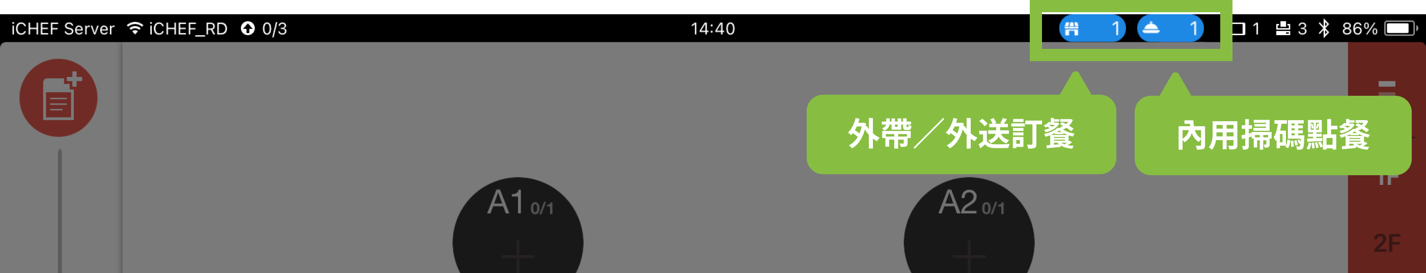 當此帳號已啟用過雲端餐廳外帶/外送訂餐、內用掃碼點餐時,將會在狀態列顯示對應圖示。