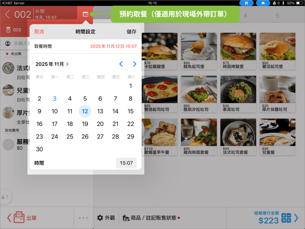 - 預約取餐(僅適用於現場外帶訂單):點擊月曆圖示,即可選取未來時間。