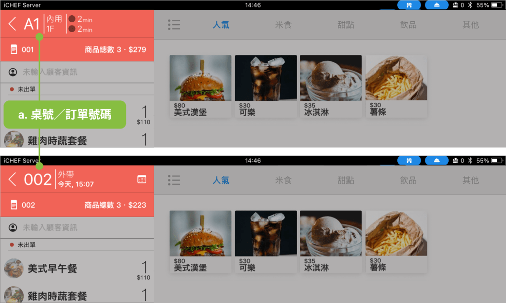 - 桌號/訂單號碼:內用顯示桌號;外帶顯示訂單號碼。