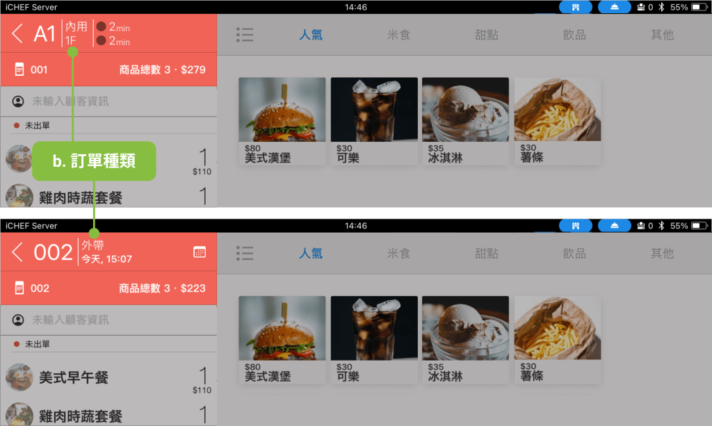 - 訂單種類:內用包含樓層;外帶包含取餐時間。