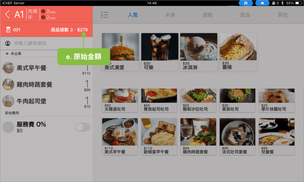 - 儲存後返回:點擊「 < 」按鈕,即可將訂單內的操作儲存,並且返回桌況頁。