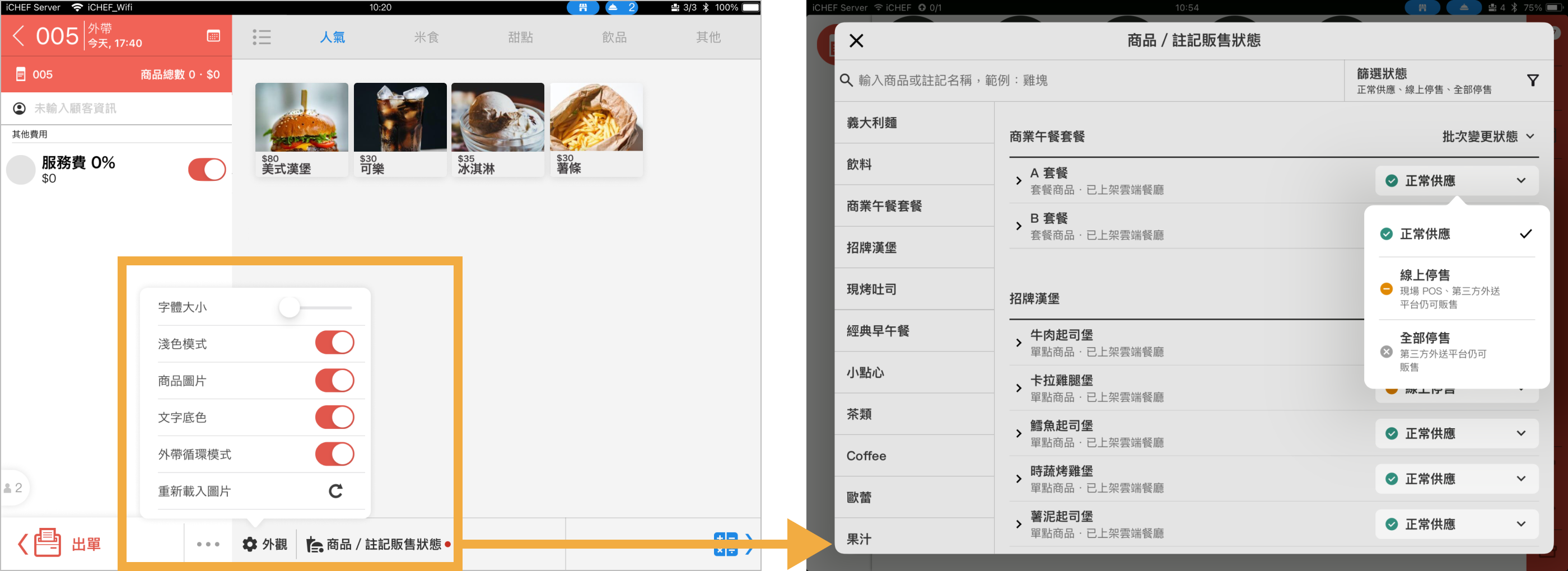 - 商品/註記販售狀態:可快速變更商品/註記販售狀態,並即時同步標示在 POS 與雲端餐廳,輕鬆避免超賣!了解更多