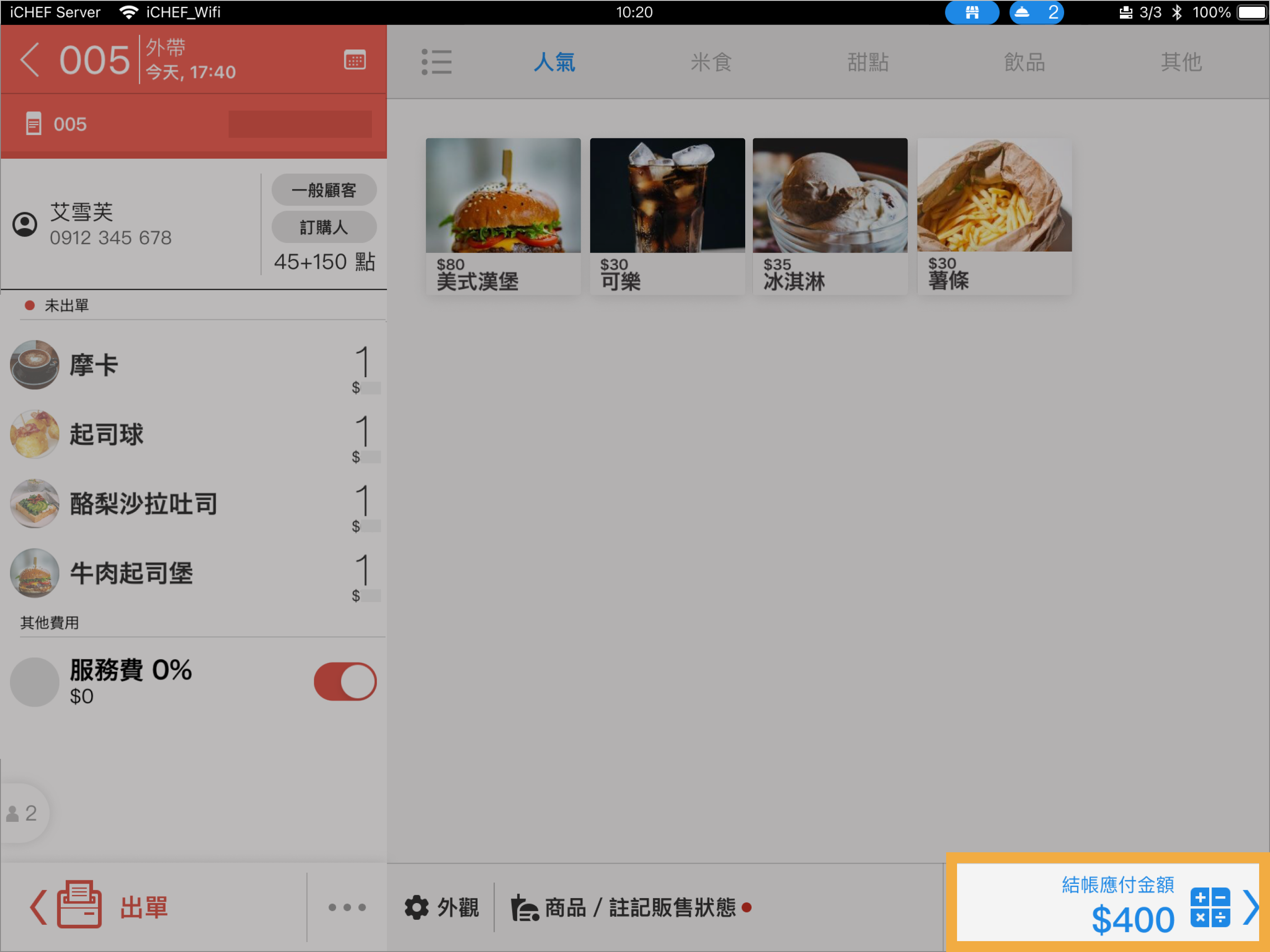 訂單內右側即為菜單,可切換樣式與外觀檢視,並在此點餐後進入結帳流程。