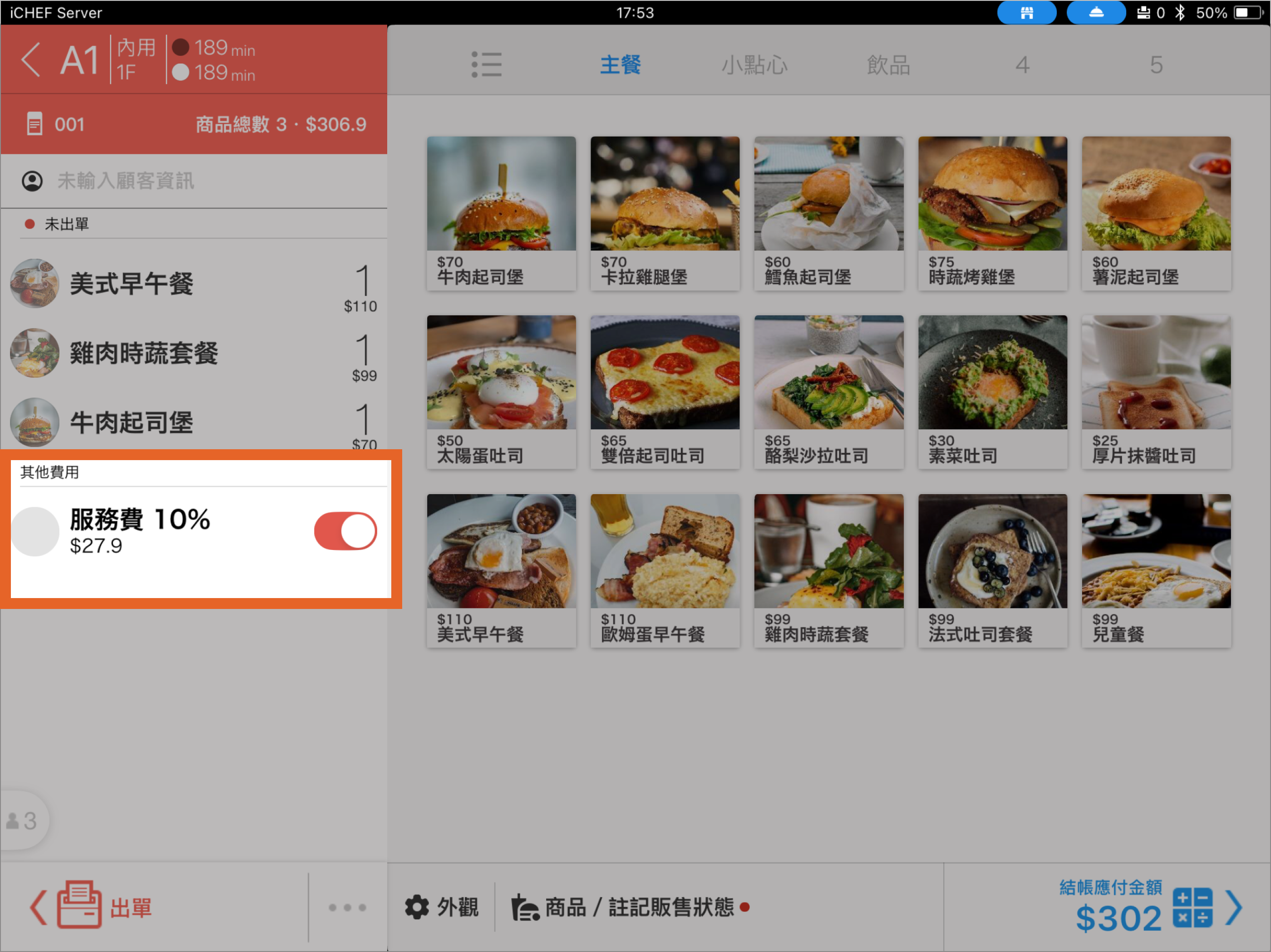 依據餐廳的營運模式,你可以在 iCHEF 後台預設「服務費」功能開關,並能針對管道設定專屬費率與顯示名稱。了解更多