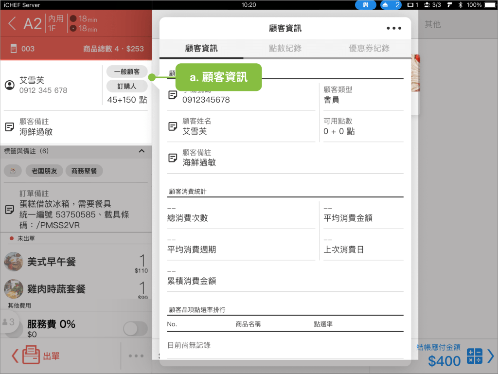 - 顧客資訊:輸入消費者手機號碼即可自動查詢到會員資料,也可由此新增為會員。
