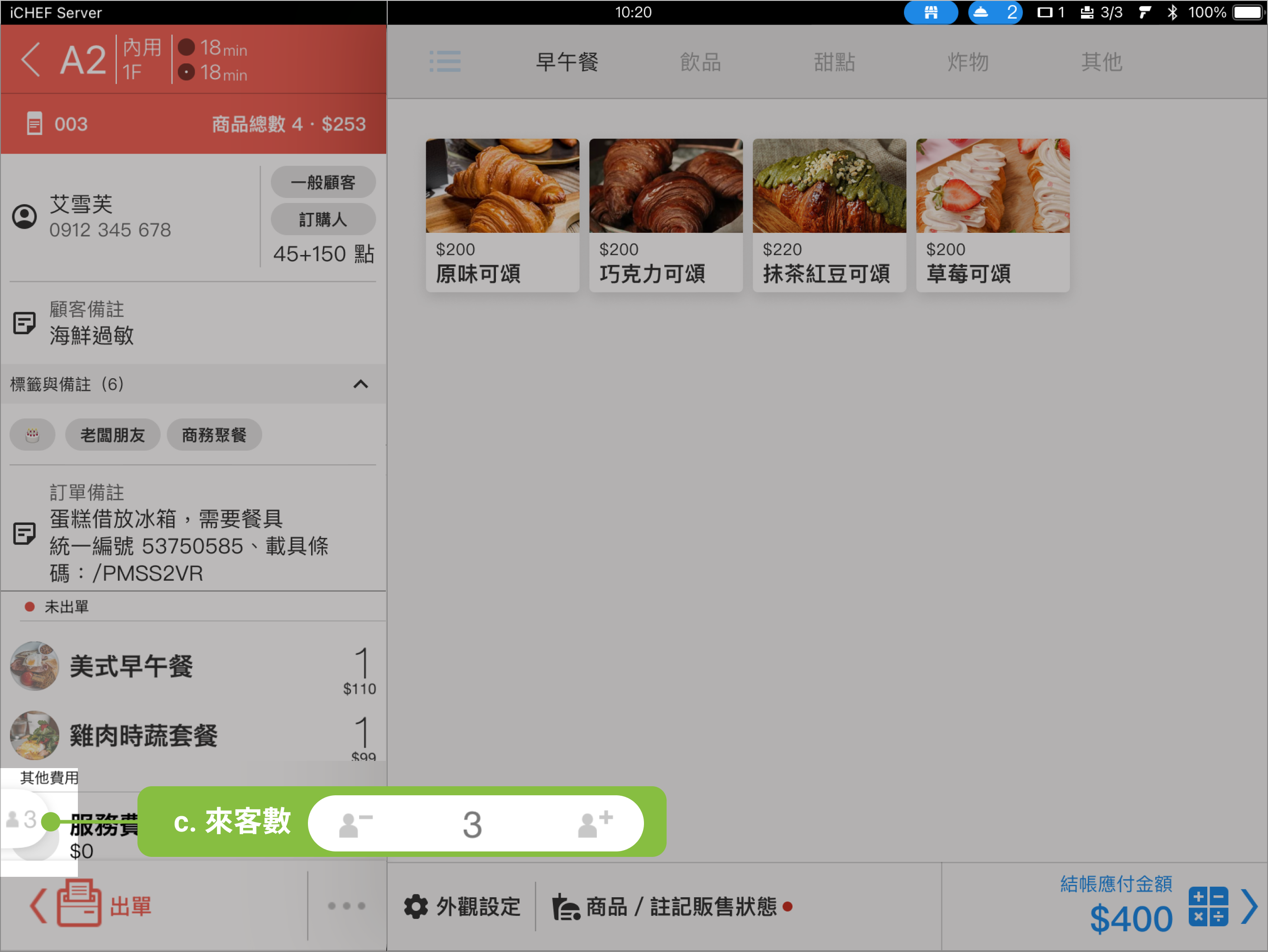 - 來客數:在訂單結帳前,點開人像圖示,即可編輯來客數。輸入的來客數,將顯示後台報表的來客分析,讓你了解店內的客人組成和平均消費單價。