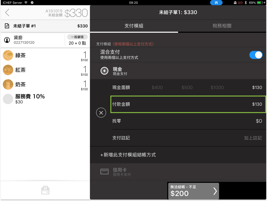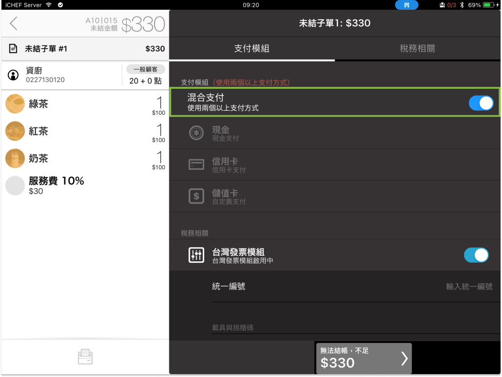 請在 iCHEF POS 結帳頁面中開啟「混合支付」。